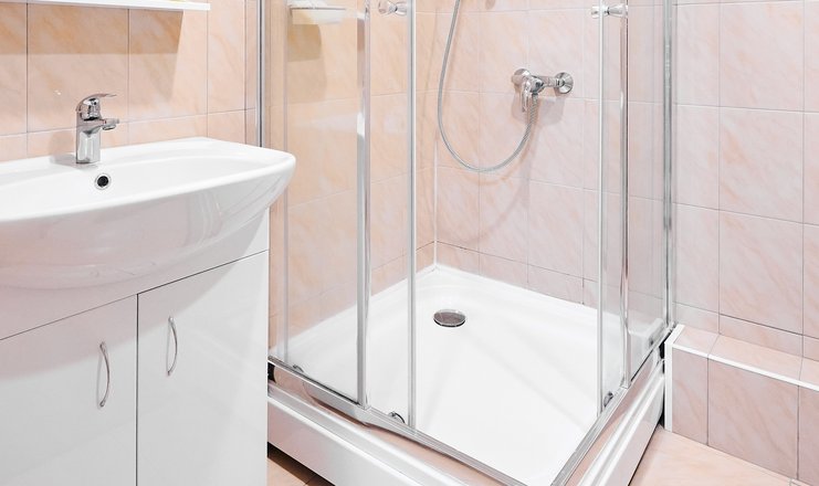 Санузел: с душевой кабиной, тапочки, туалетные принадлежности, фен