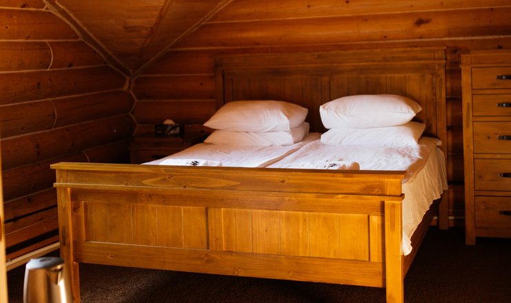 В номере: кровати односпальные: 2 шт., дополнительные, кровать двуспальная: 2 шт., прикроватные тумбочки, стол, стулья, шкаф, Оборудование, набор посуды, холодильник, чайный набор посуды, электрочайник
