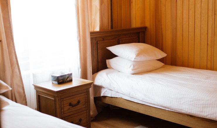 В номере: кровати односпальные, прикроватные тумбочки, стол, стул, шкаф, холодильник, чайный набор посуды, электрочайник