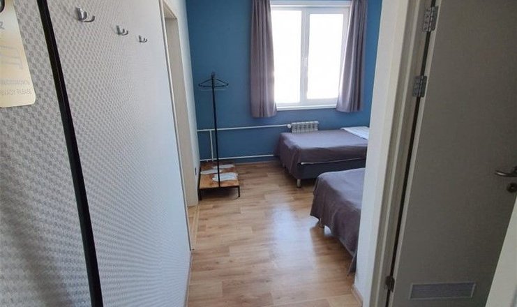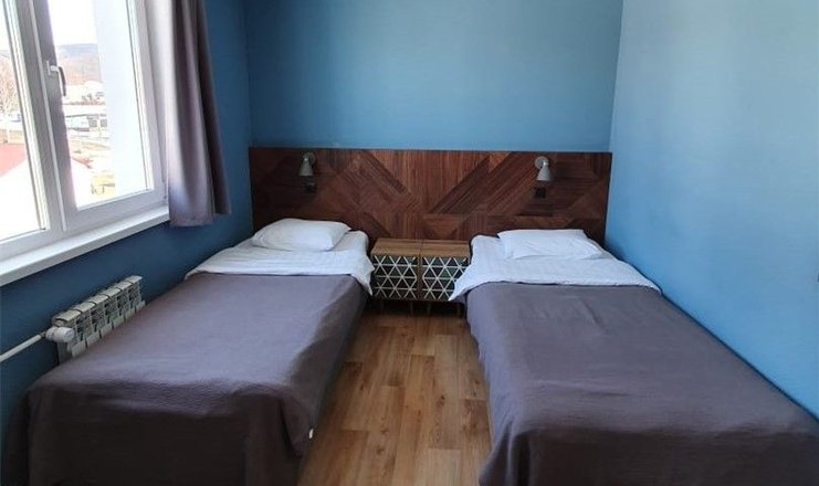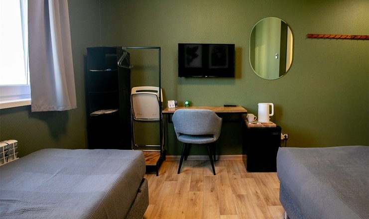 В номере: вешалка, зеркало, кровати односпальные, прикроватные тумбочки, стол, стулья, шкаф, кондиционер, мини-холодильник, телевизор, чайная станция