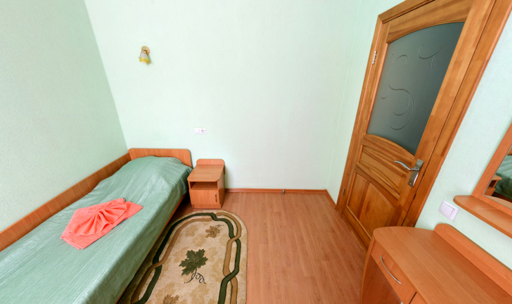 В номере: мини-холодильник, одна полуторная кровать, стол, стул, телевизор, тумбочка, электрочайник, набор посуды, зеркало, вешалка